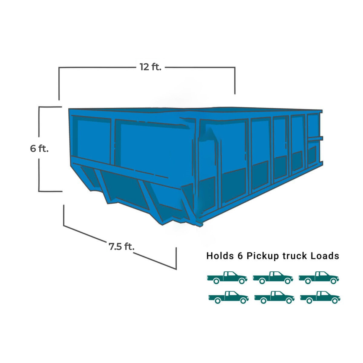 A 16 yard dumpster measures 12 feet long, 7.5 feet wide, and is 6 feet tall. These dimensions make the dumpster fit nicely on a residential driveway. Its lower profile makes it easy to use and load. A 16 yard dumpster hold 15 cubic yards of waste, about 6 full pickup loads of trash.